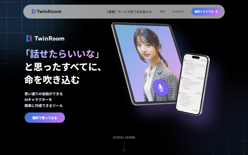 TwinRoomは、誰でも簡単にAIキャラクターを作成・管理できるプラットフォームです。独自の感情特化型LLMエンジン「Geppetto」を搭載し、一般的なLLMとは異なる自然な口語形式の会話に特化しています。 LINE・API連携でプライベート・ビジネス問わず利用可... -