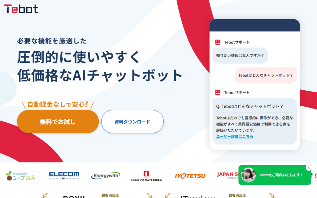 Tebotは、企業の問い合わせ対応を自動化するAIチャットボットサービスです。FAQの自動応答やシナリオ型の対話フローを簡単に構築でき、社内外からの問い合わせ対応工数を大幅に削減します。 生成AI機能を搭載しており、登録されたFAQだけでなく、自然な文... -