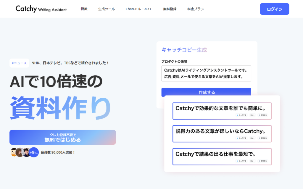 Catchyは、ChatGPTを搭載した国内最大級のAIライティングアシスタントツールです。広告コピー、記事作成、メール文面、YouTube企画案など100種類以上の生成ツールを提供し、マーケティングに必要な文章作成を幅広くカバーします。広告・マーケティング担当...