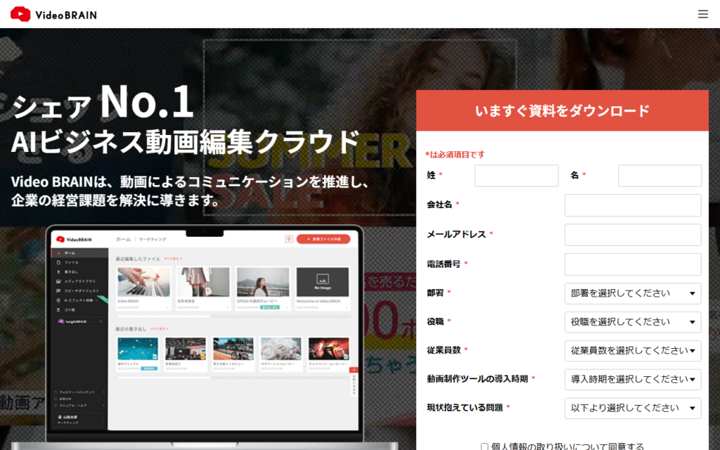 Video BRAINは、5年連続シェアNo.1のAIビジネス動画編集クラウドです。AIのサポートにより動画制作未経験者でもパワーポイント感覚で高品質な動画を数分で作成できます。3,500本以上のテンプレートと1,000万点以上の素材が利用可能です。 ChatGPTを搭載し... -