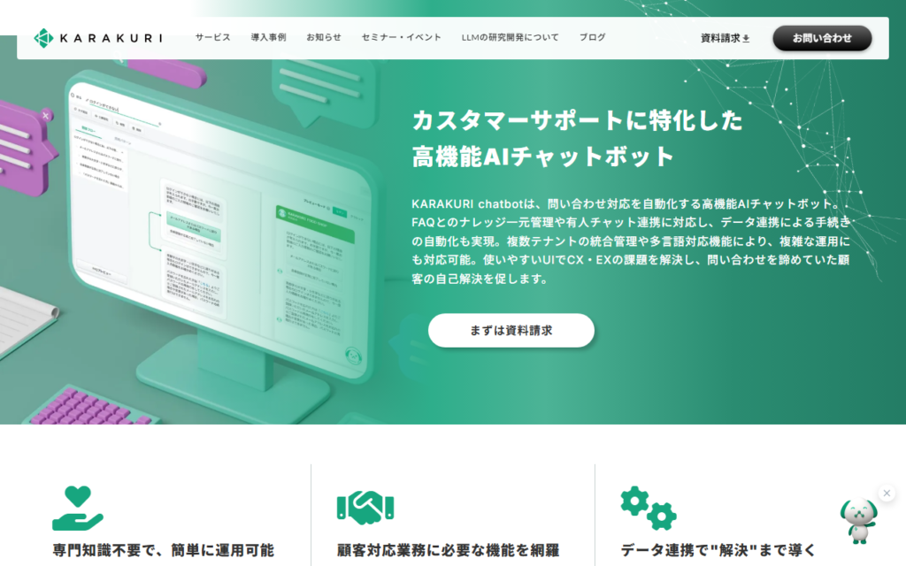KARAKURI chatbotは、カスタマーサポートに特化した高精度AIチャットボットです。24時間365日自動対応し、プログラミング不要の特許取得済みUIで直感的に運用管理が行えます。最新の生成AIを搭載したハイブリッド型に進化しています。導入時にコミットした... -