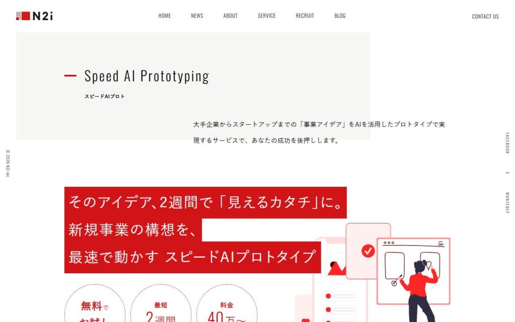 Speed AI Prototypingは、株式会社N2iが提供するAI活用型プロトタイピングサービスです。新規事業アイデアを最短2週間で「見えるカタチ」に実現します。発注前に無料のUIプロトタイプで実際の操作感を体験でき、料金は40万円からとなっています。SaaS開発... -