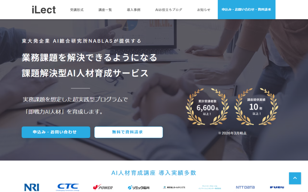 iLectは、東京大学発AI総合研究所NABLASが提供する法人向け課題解決型AI人材育成サービスです。東京大学で開発されたDeep Learning講座やデータサイエンティスト育成講座の正式ライセンスを受け、実課題をもとにしたコンペ形式の演習型カリキュラムで即戦... -