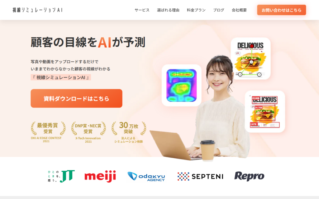 視線シミュレーションAIは、アイトラッキングデバイスから収集した大量の視線データを学習したAIにより、画像や動画上で人がどこに注目するかを数秒で可視化するサービスです。チラシやPOP、野外広告、デジタルサイネージ、商品パッケージなど幅広い販促物... -