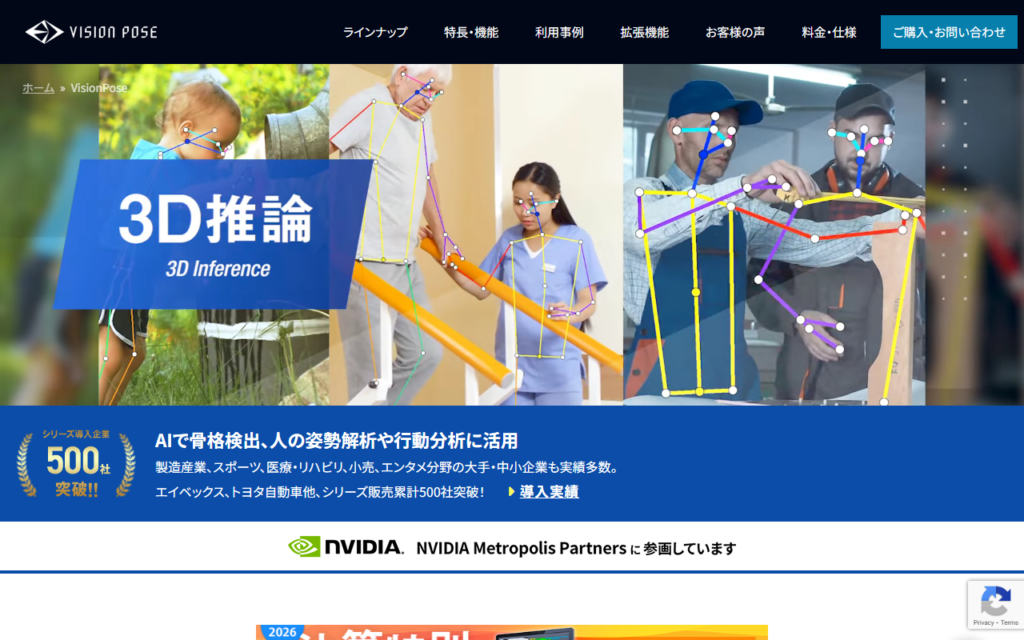 VisionPoseは、独自開発の姿勢解析AIエンジンで、人体の骨格情報をリアルタイムに検出・解析する技術です。国内500社以上の企業に提供されており、スポーツにおける運動フォーム解析、リハビリテーションでの歩行解析、工場における作業員の動作分析、エン...