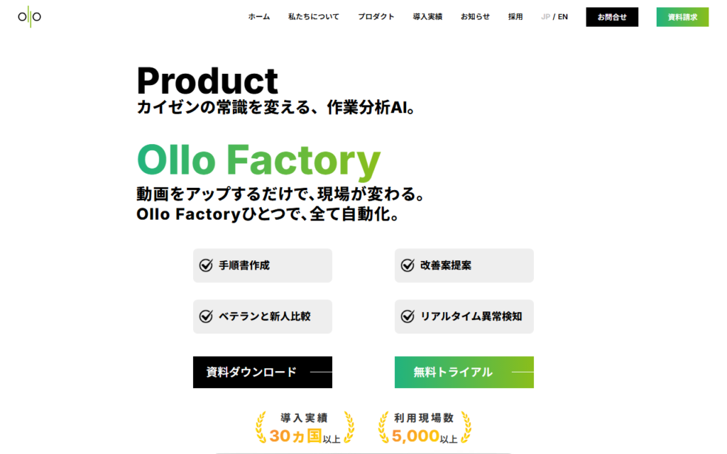 Ollo Factoryは、カメラひとつで工場の作業を解析するAI画像認識ソフトウェアです。作業現場の動画をアップロードするだけで、AIが自動的に繰り返し作業を検出し、作業のばらつきや抜け、ムダを発見して現場の生産性向上を支援します。独自のOne-Shot学習...
