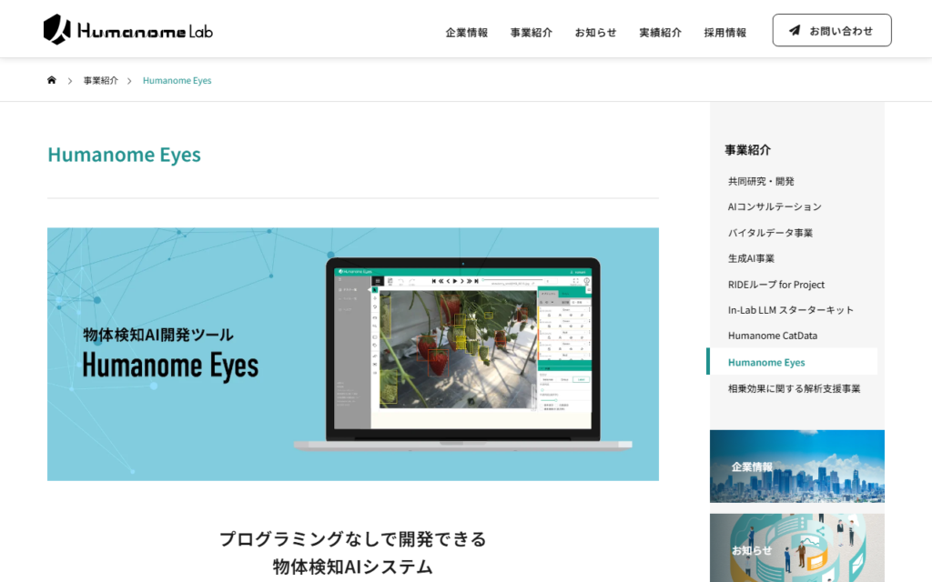 Humanome Eyesは、プログラムを一切書くことなくマウス操作だけでAI物体検知モデルを構築できるノーコードAI開発プラットフォームです。「AIの民主化」を理念に開発されており、IT導入補助金対象ツールに3年連続認定されています。専門知識がなくてもAIモ... -
