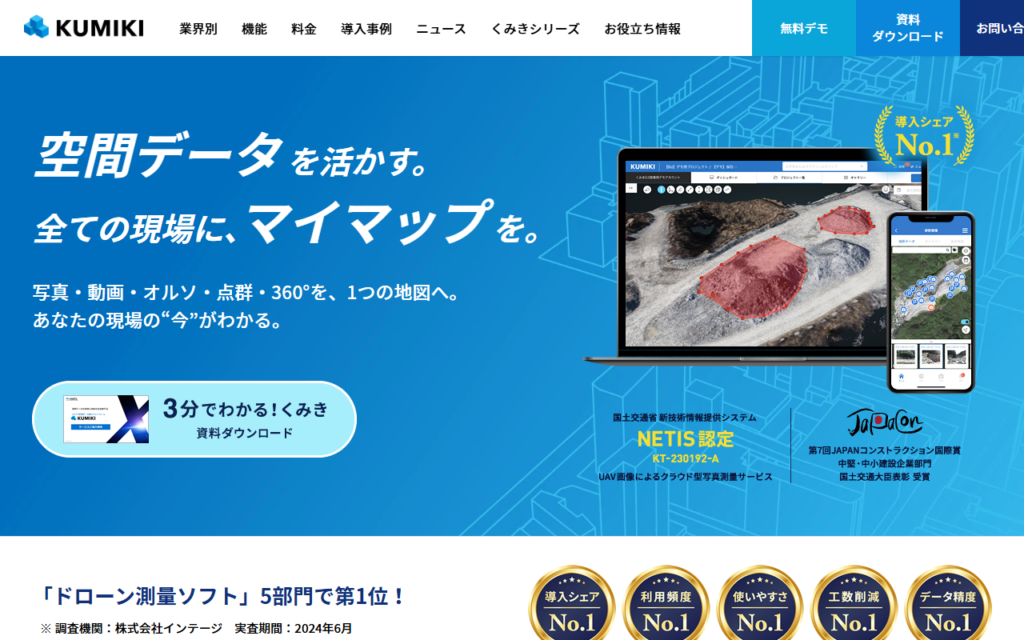 くみきは、ドローンで撮影した画像をクラウド上でAI解析し、3Dモデルやオルソ画像を自動生成するプラットフォームです。建設現場の土量計算、農地の生育状況分析、インフラの劣化検知などに活用できます。専門知識がなくても、画像をアップロードするだけ... -