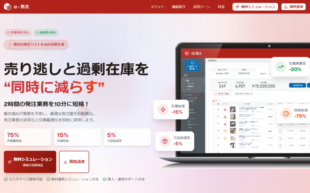 α-発注は、需要予測AIを搭載した発注リスト自動作成システムです。需要の変動と仕入条件を加味した発注リストを自動作成し、過剰発注や在庫切れを防止します。現在の発注ルールを踏襲したまま、AIが適切な発注量を算出します。 在庫状況をリアルタイム監視... -