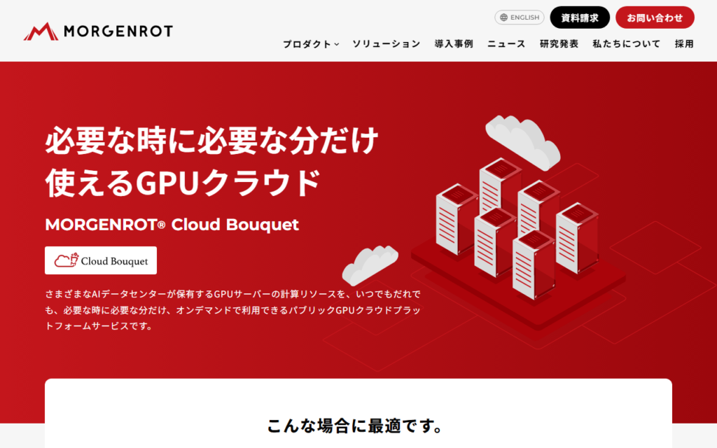 MORGENROT Cloud Bouquetは、複数のAIデータセンターが保有するGPUサーバーの計算リソースをオンデマンドで利用できるパブリックGPUクラウドプラットフォームです。独自の分散処理技術「Excalibur」を活用し、時間単位での柔軟なリソース利用が可能です。A... -