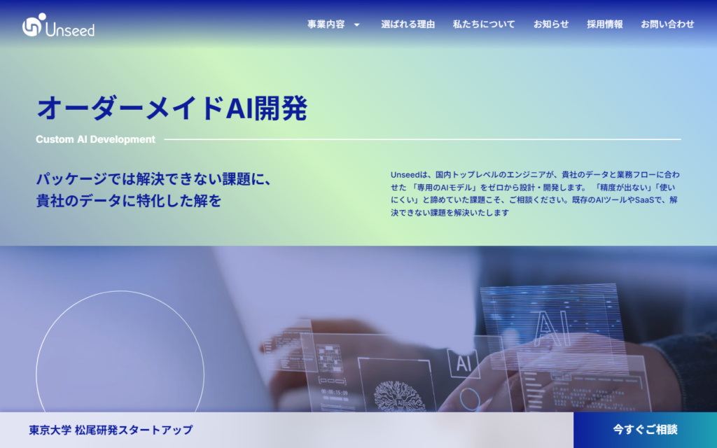 株式会社Unseedが提供するオーダーメイドAI開発サービスです。東大松尾研発・信州大学発スタートアップとして、パッケージではカバーできない企業固有の課題に対し、アルゴリズムから新規構築するフルスクラッチAI開発を行います。画像認識、自然言語処理... -