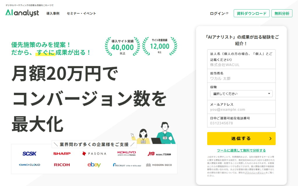 AIアナリストは、Google Analyticsなどのアクセス解析データをAIが自動分析し、Webサイト改善・SEO・広告運用などのデジタルマーケティング施策を最適化するサービスです。豊富なベンチマークに基づいた改善提案を自動生成します。 データ分析から改善ポイ... -