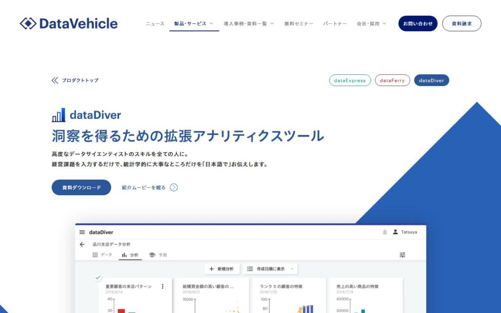 dataDiverは、DataVehicle社が提供する拡張アナリティクスツールです。経営課題を入力するだけで、統計学的に重要な洞察を日本語で得られます。3ステップの簡単な操作で分析用データを自動生成し、結果は自然言語と美しいグラフで表示されます。統計学や機... -