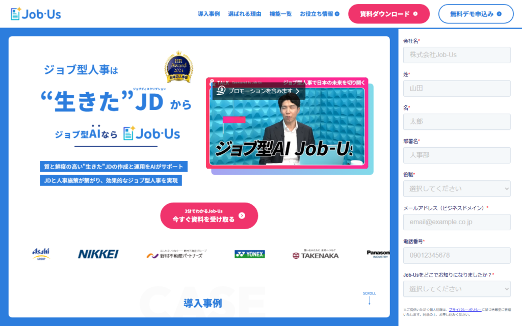 株式会社Job-Usが提供する「Job-Us」は、AIを活用したジョブ型人事クラウドサービスです。AIがジョブディスクリプション(JD)を自動作成し、作成時間を80%以上削減します。新機能「目標設定AI」により、経営目標と社員個人の目標を整合させ、ジョブ型人事... -