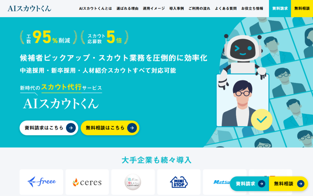 TechSuite株式会社が提供する「AIスカウトくん」は、生成AIを活用した新時代のスカウト代行サービスです。候補者選定からスカウト文作成までをAIが担当し、採用専門家が品質チェックするハイブリッド型の仕組みにより、採用担当者の工数を95%削減・採用決... -