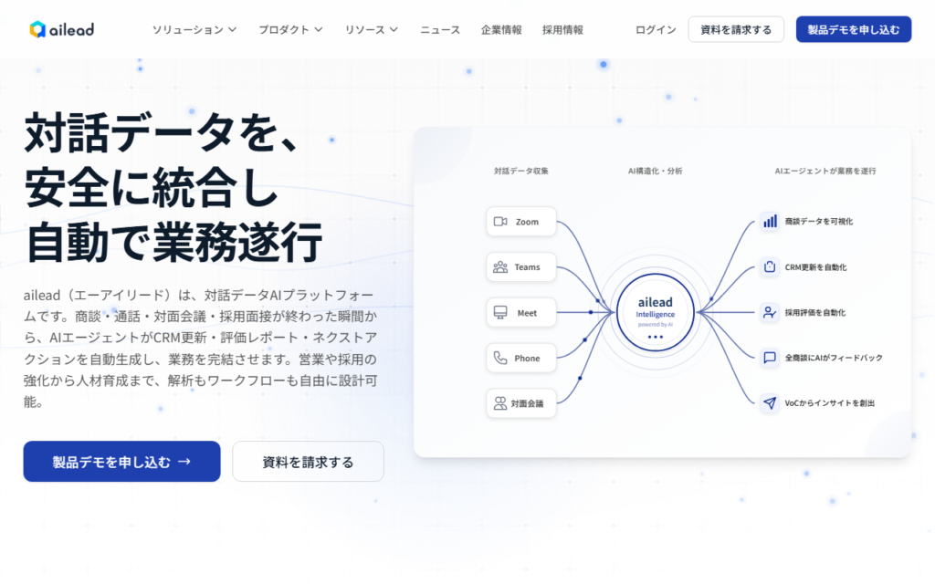 株式会社aileadが提供する「ailead」は、商談・Web会議・採用面接の対話データを一元管理するAIプラットフォームです。録画・書き起こし・AI解析を自動で行い、トピック・合意事項・懸念点・次アクションを抽出します。SFA/CRMへの自動入力やタスク起票ま... -