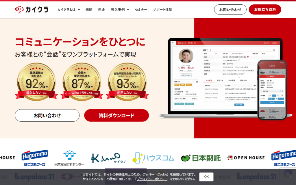 株式会社シンカが提供する「カイクラ」は、電話・SMS・メール・ビデオ通話など企業の顧客対応チャネルをひとつの画面で一元管理するクラウドコミュニケーションプラットフォームです。着信時に顧客情報を自動ポップアップ表示し、通話内容を自動録音・AIが... -
