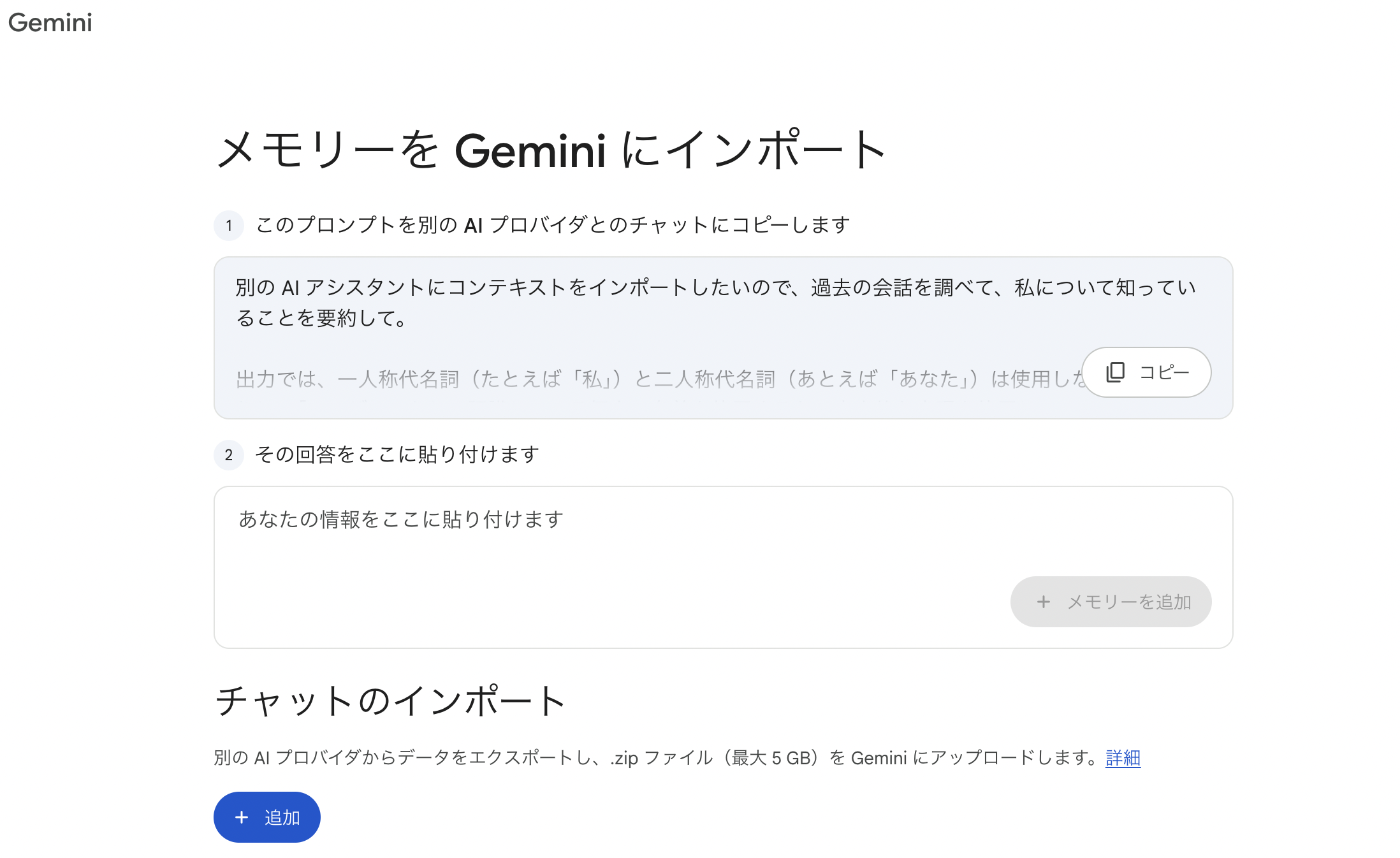Googleはこの課題に対応するため、「Import Memory」と「Import Chat History」の2つの機能をGeminiに追加しました。ユーザーが以前使っていたAIの情報を素早くGeminiへ移行できるよう、専用のプロンプトや手順を用意することで、スムーズなサービス移行を実現しています。これはAIサービス間のユーザー流動性が高まりつつある現在のトレンドにも合致した取り組みといえます。