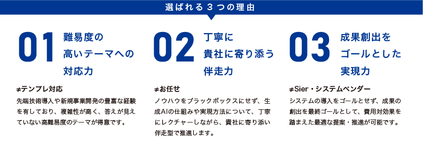 三つ目は、成果創出をゴールとしている点です。単に生成AIツールを導入して終わりではなく、ツールを活用することで業務プロセスや意思決定をどのように変え、どのような成果につなげるかを起点に支援しています。そのため、導入初期の設計にとどまらず、現場への定着支援や活用方法の磨き込みまで伴走し、実際に「使われること」「成果が出ること」にこだわっている点が強みです。