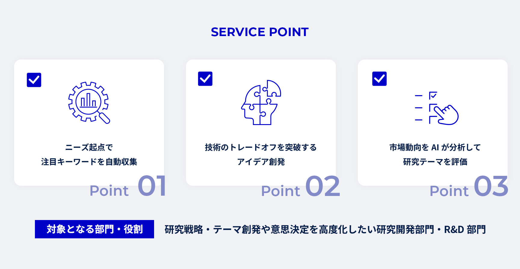 AI活用を検討している企業の中でも、特に研究開発部門や新規事業部門、知財部門など、価値創出に取り組む企業や部門を主な対象としています。