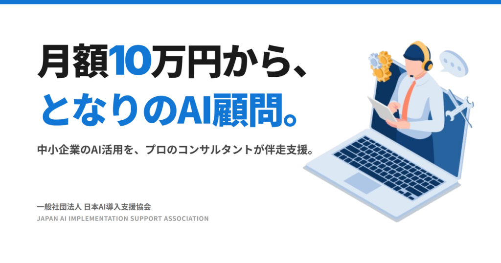 AI活用に関する継続的な助言・相談対応を行うサービスです。月次のミーティングを通じて、ツール選定、業務への実装、社内からの相談対応などを支援します。